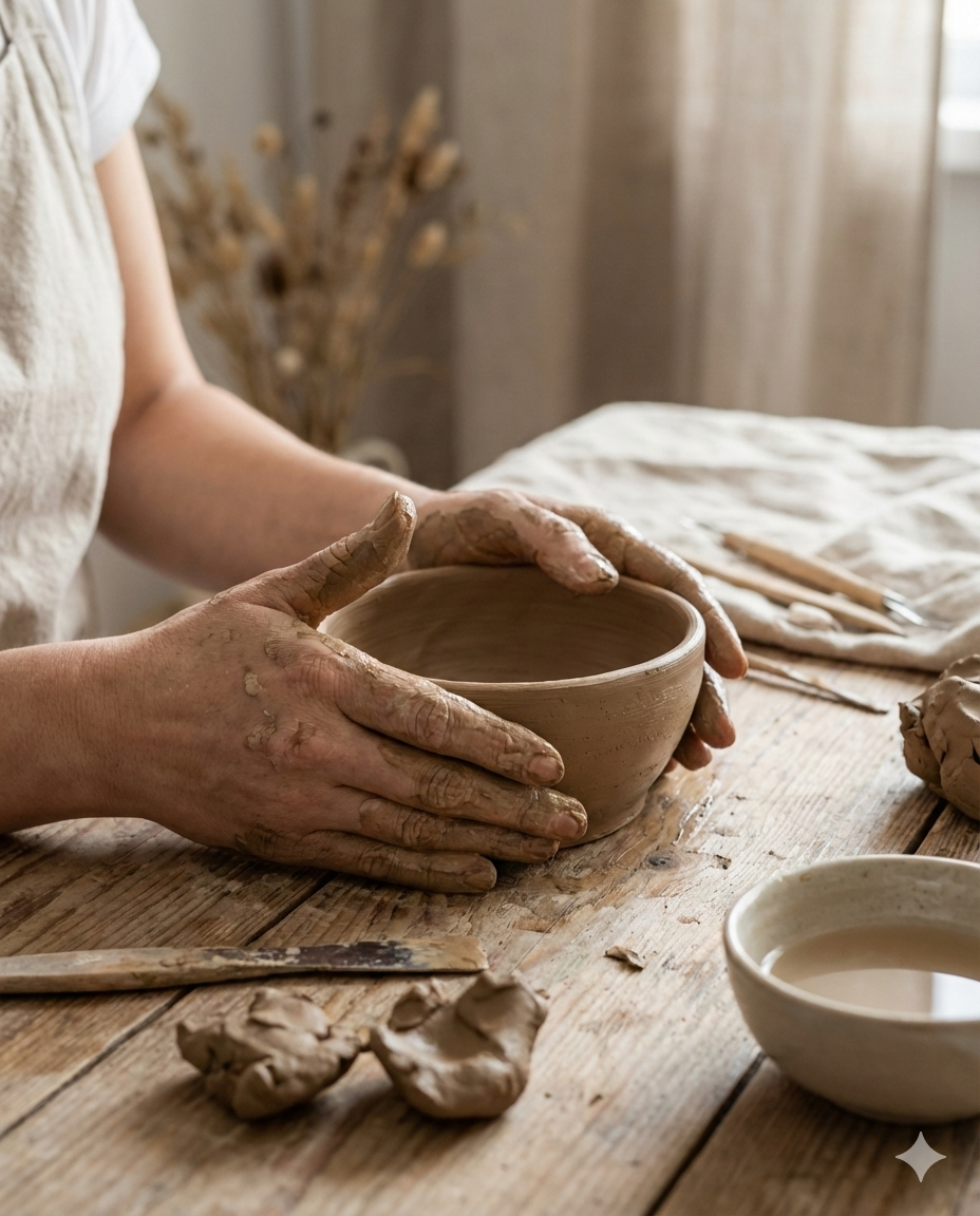 Verde Barro nasceu da vontade de levar essa experiência para dentro da sua casa. Camila deixou o mundo corporativo para colocar as mãos no barro e criar memórias com quem você ama — sem turmas lotadas, sem pressa.